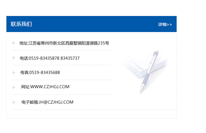 傳真:0519-83435688    郵編:213135    網(wǎng)址:WWW.czjhgj_com.czxinan.com    電子郵箱:JH@czjhgj_com.czxinan.com